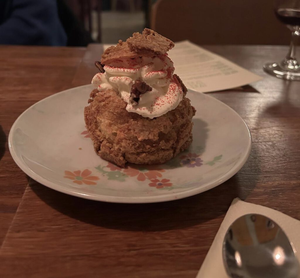 The cream puff made with Thai tea ganache, salted whipped cream, and pecan crunch appealed to all our taste buds. It had a bitter, salty, sweet, and crunchy note and developed more depth with every bite.